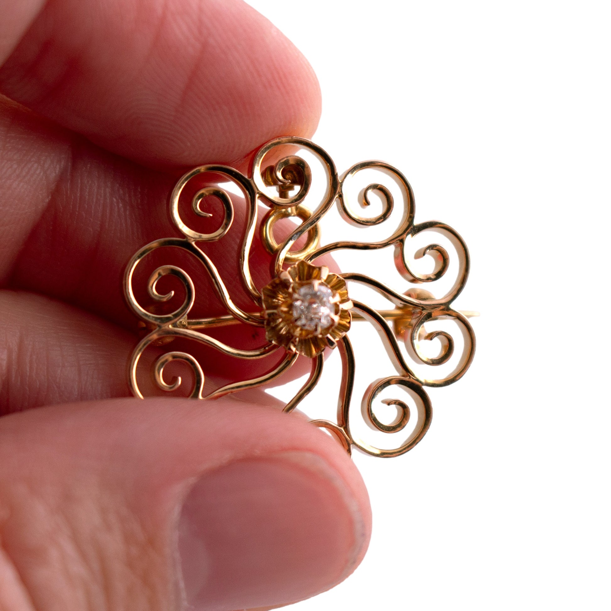An antique 14k yellow gold swirl circle pin/pendant with an old mine cut center diamond. The ring flips up so it can be worn as a pendant. It has been gold tested with an Auracle AGT3 electronic gold tester. In good condition. The diamond has an estimated carat weight of 0.10ct.