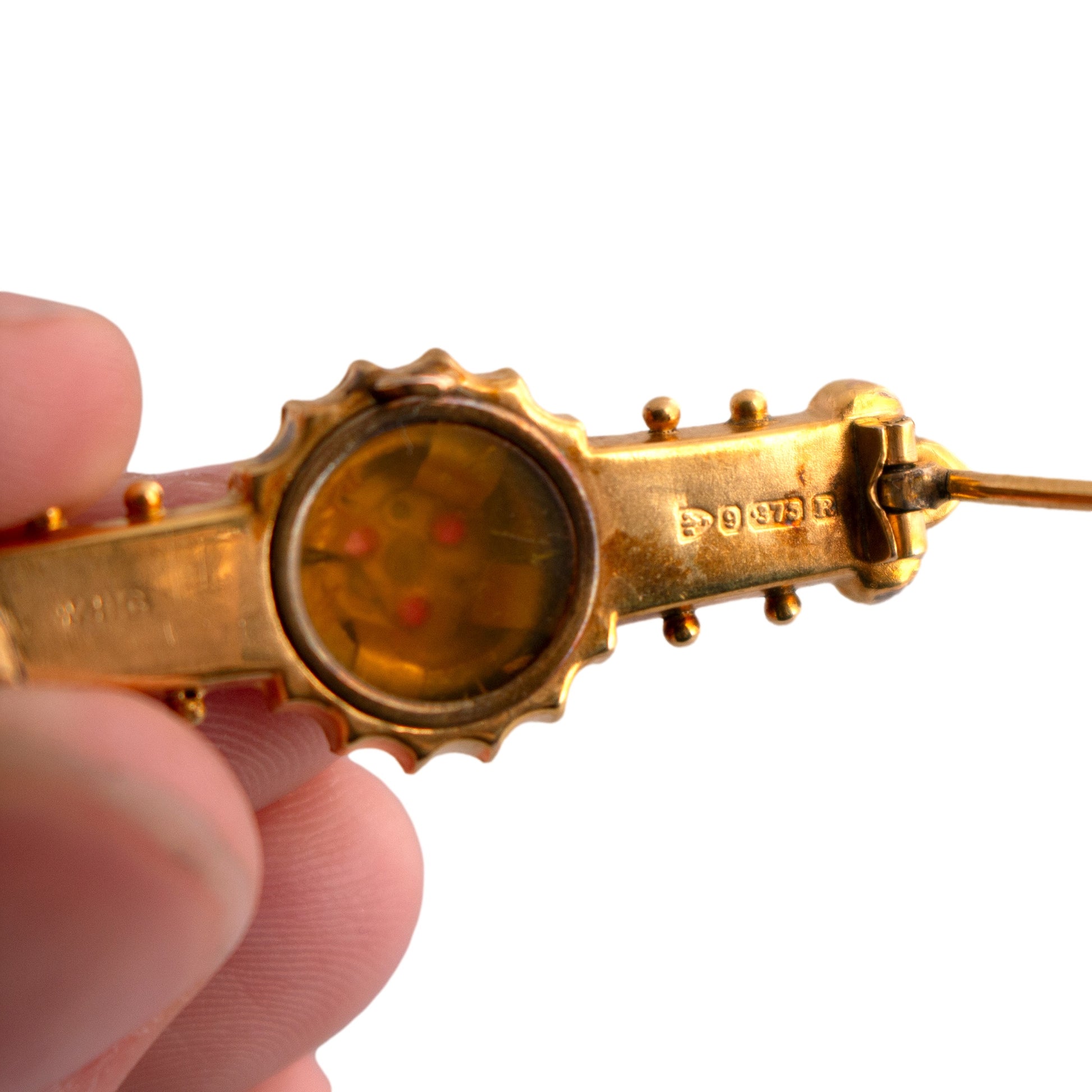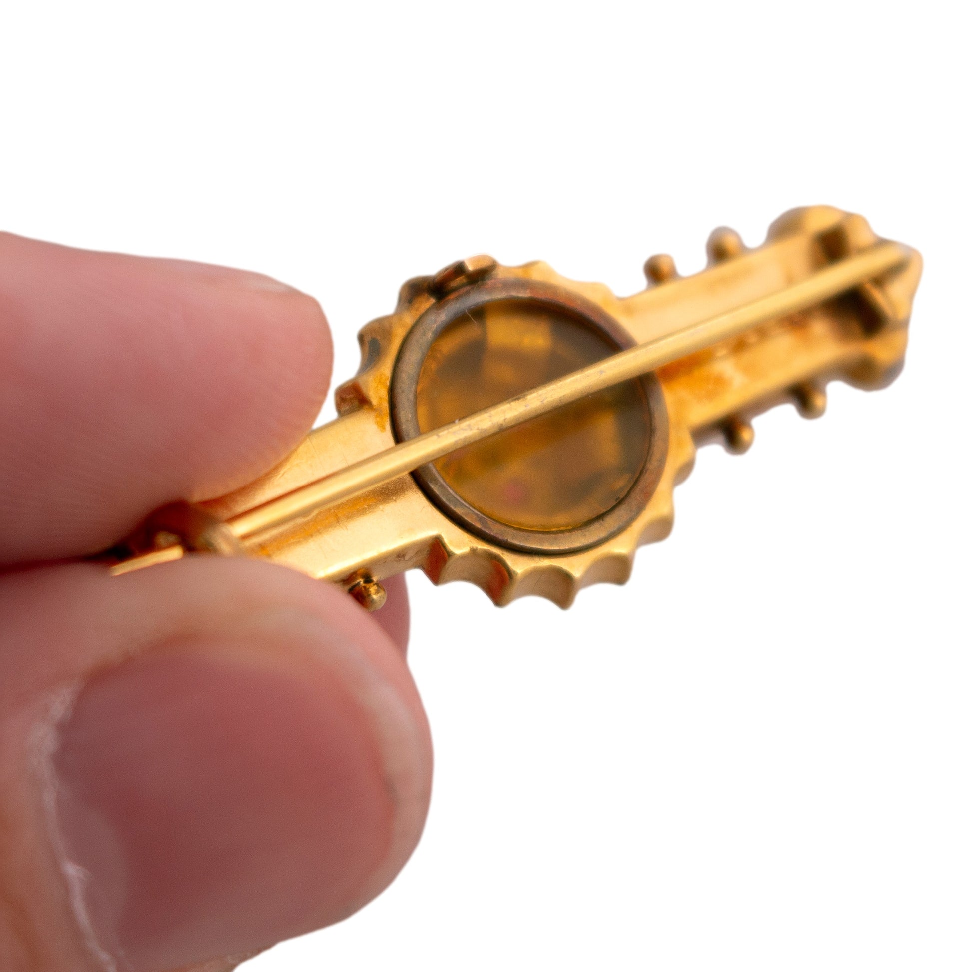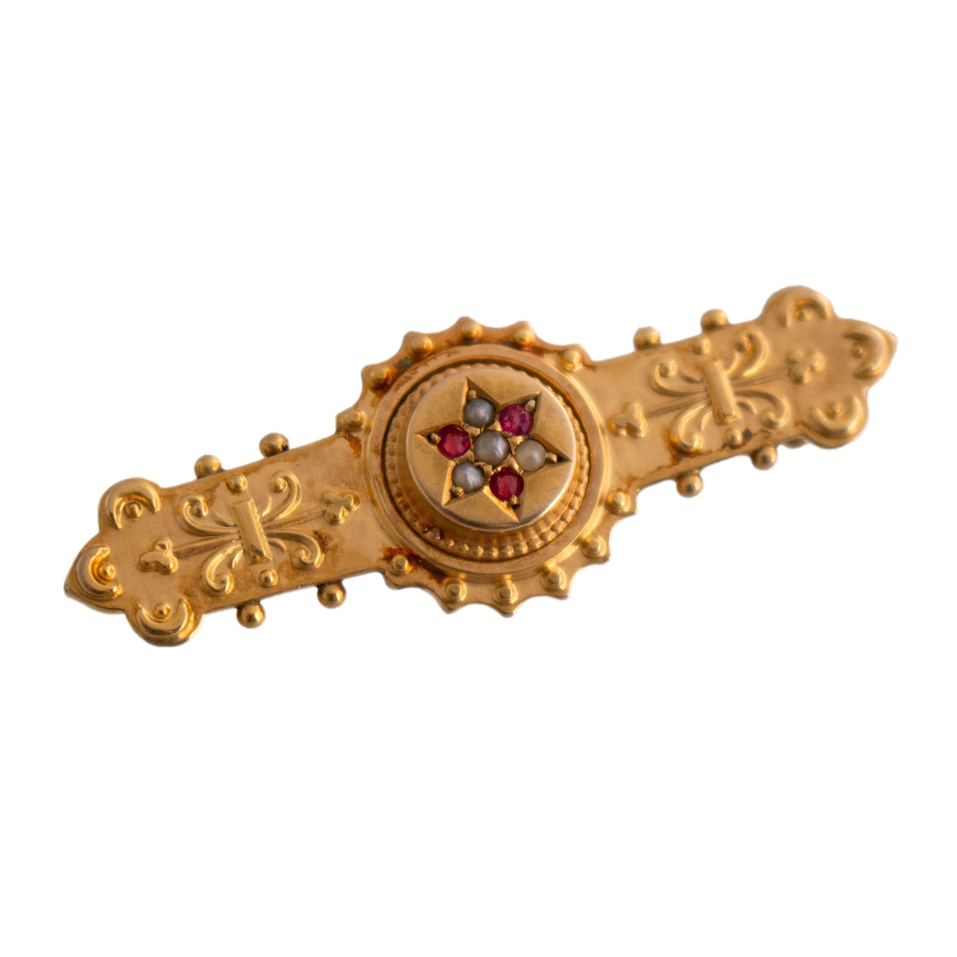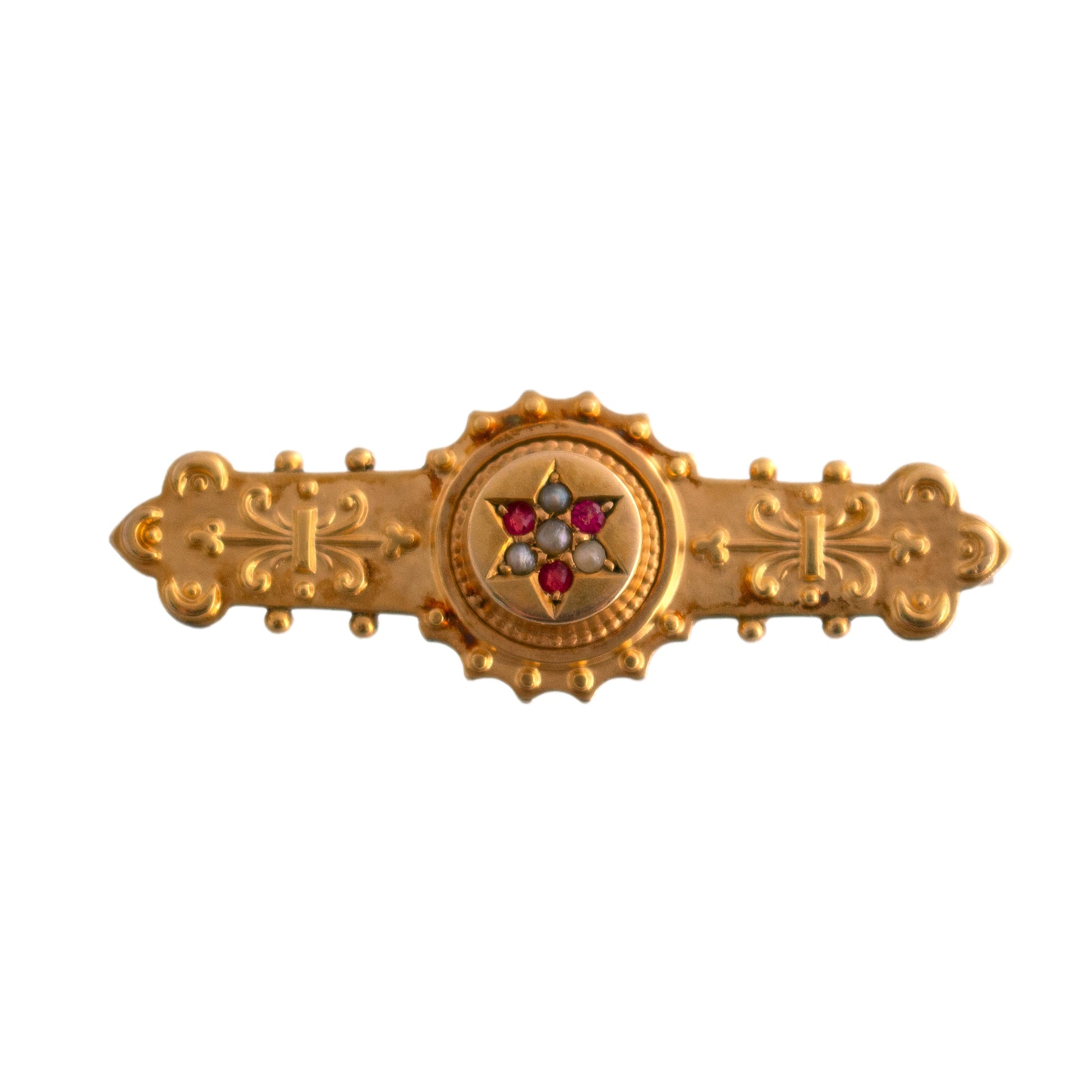 An antique 9k yellow gold ruby and seed pearl bar brooch. This is a mourning piece with a little glass capsule in the back that could hold a lock of hair. It is stamped with hallmarks. The front shows a little bit of tarnish but otherwise in good condition. It is 1.75 inches across.