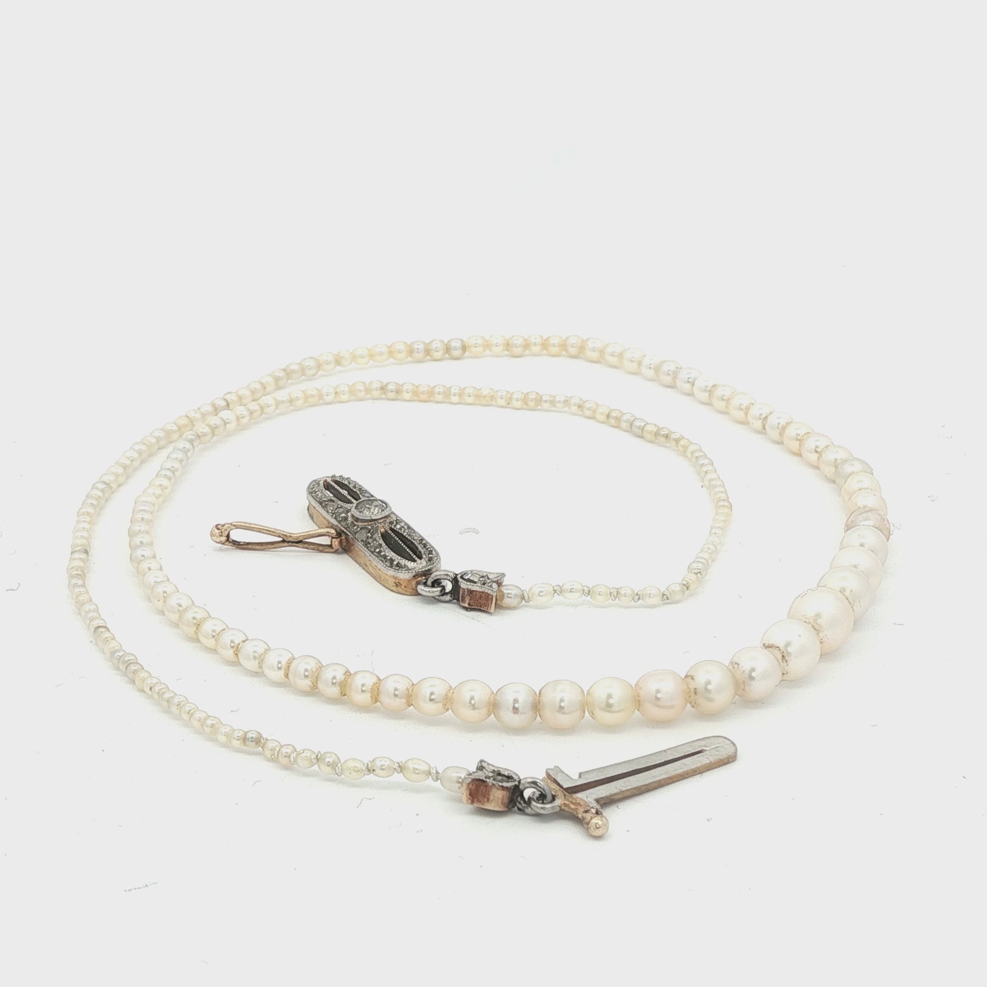 This Edwardian necklace features a single strand of natural pearls, gradually increasing in size towards the center. The pearls are lustrous and evenly spaced, creating a classic and elegant silhouette.