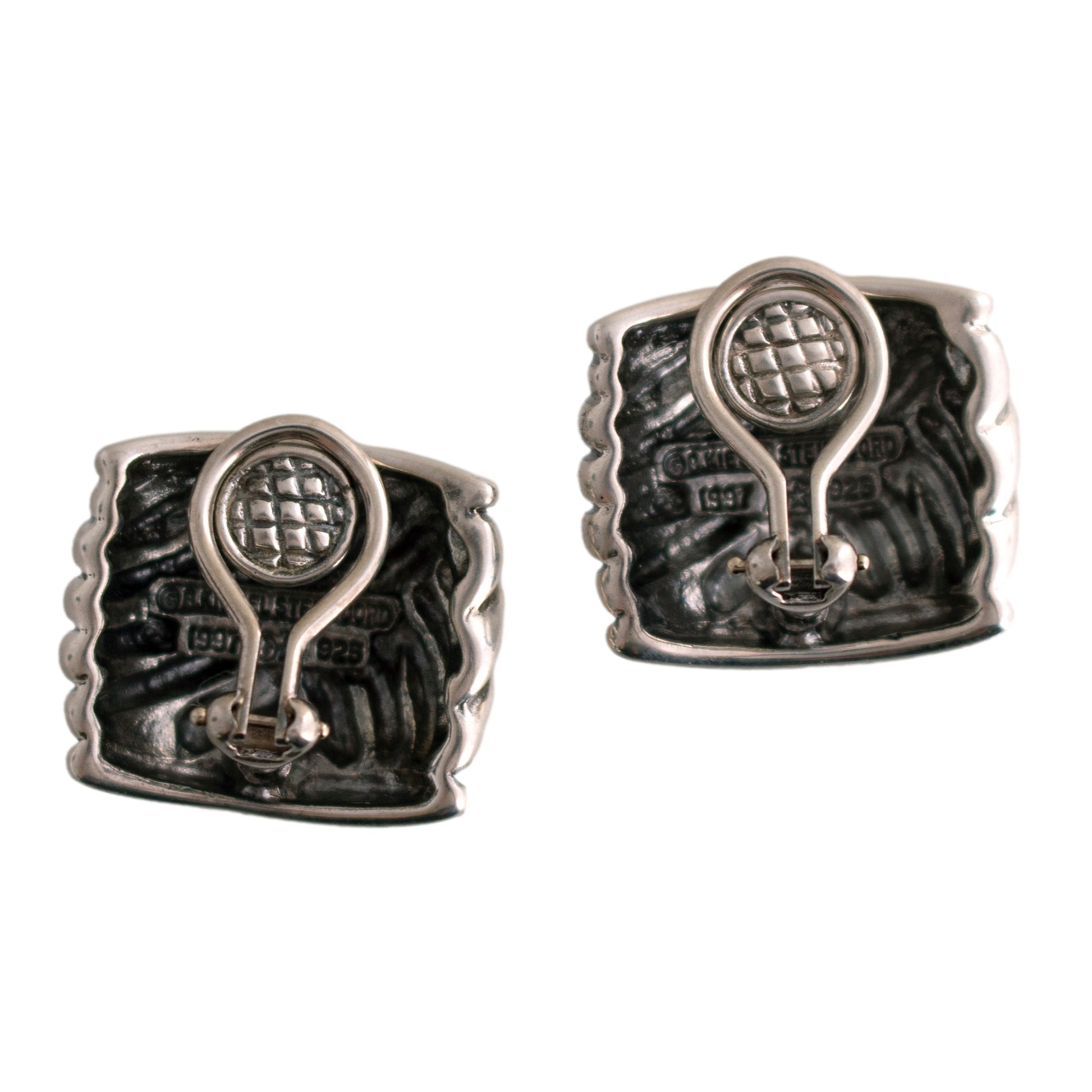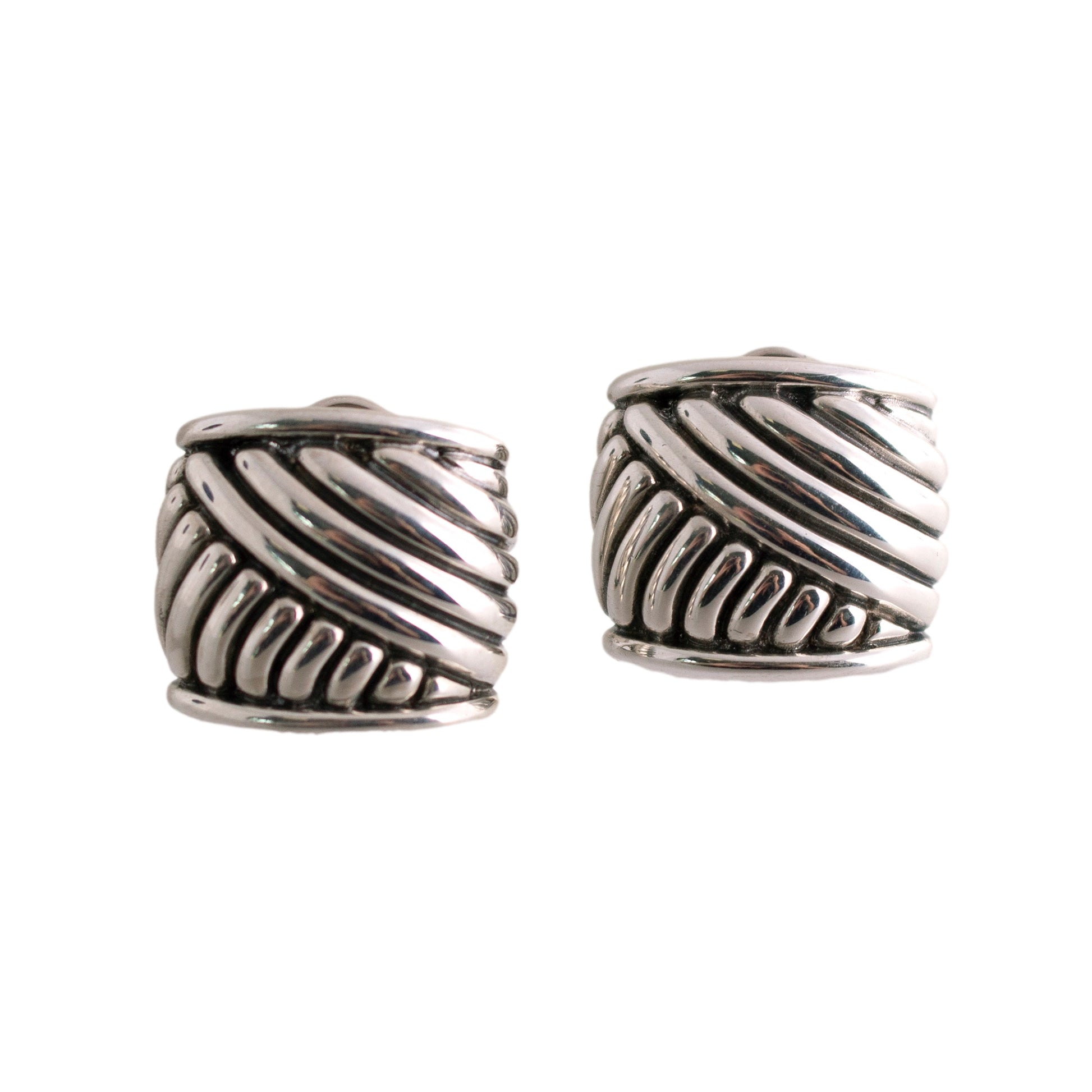 A pair of vintage sterling silver diagonal line clip on earrings by Kieselstein-Cord. The backs are signed. The earrings measure 3/4 an inch across. In good condition.