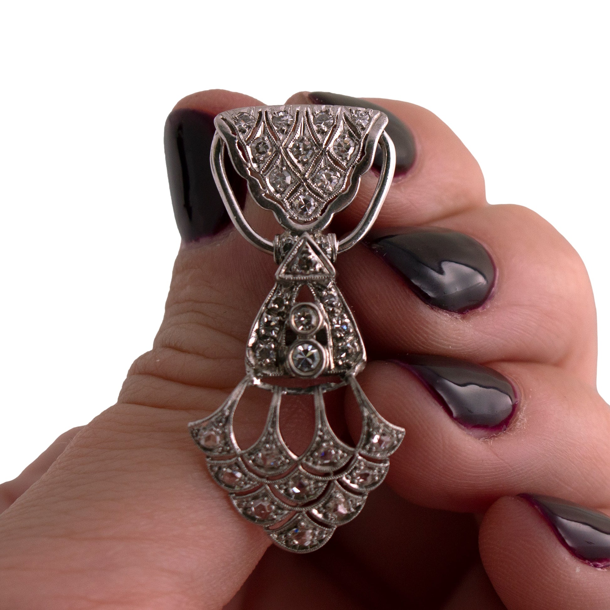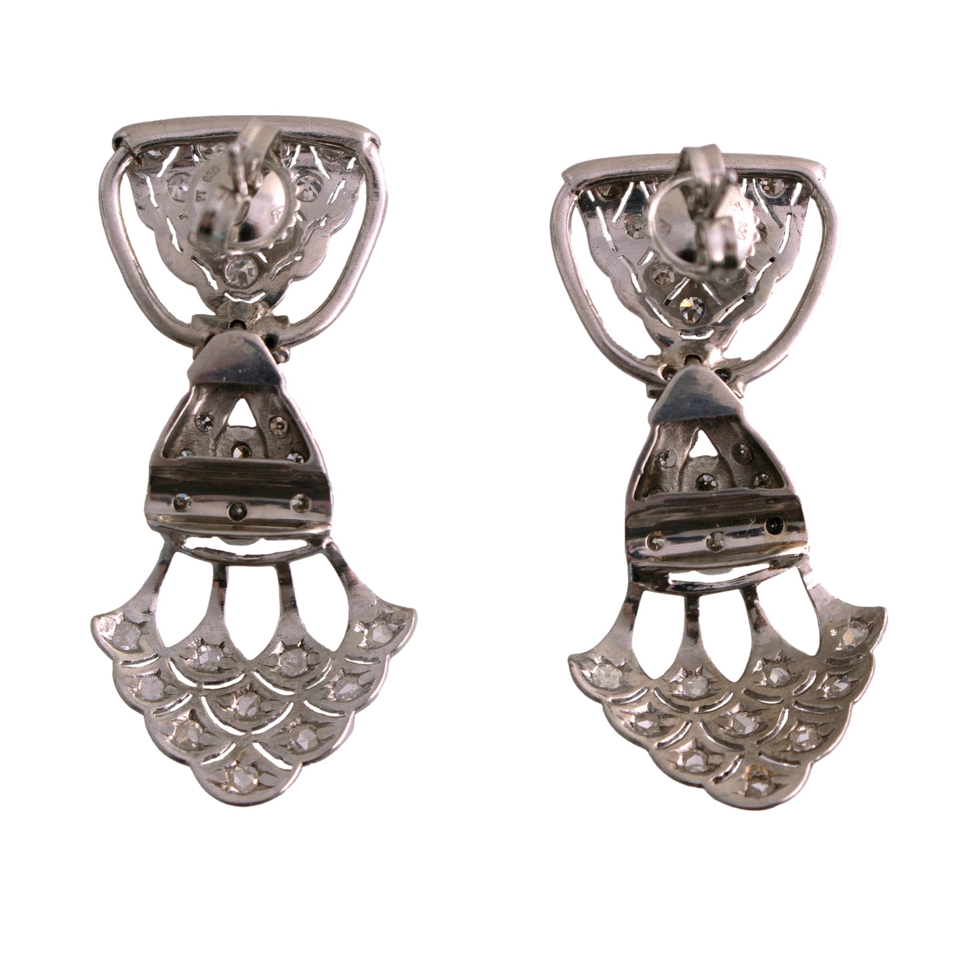 A pair of antique platinum and diamond earrings. These are so elegant and perfect for a wedding or special event. They have posts with friction backs. The round diamonds have a total approximate carat weight of 1.32ct and the rose cuts have an approximate total carat weight of 0.12ct. In great condition. They are 1 and 3/8 inches long.