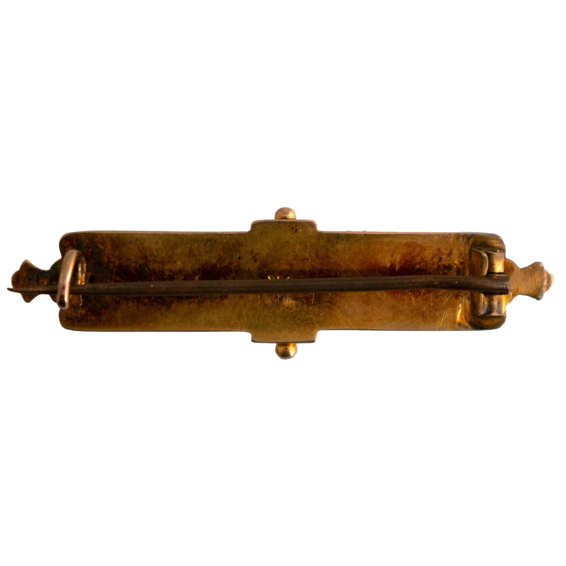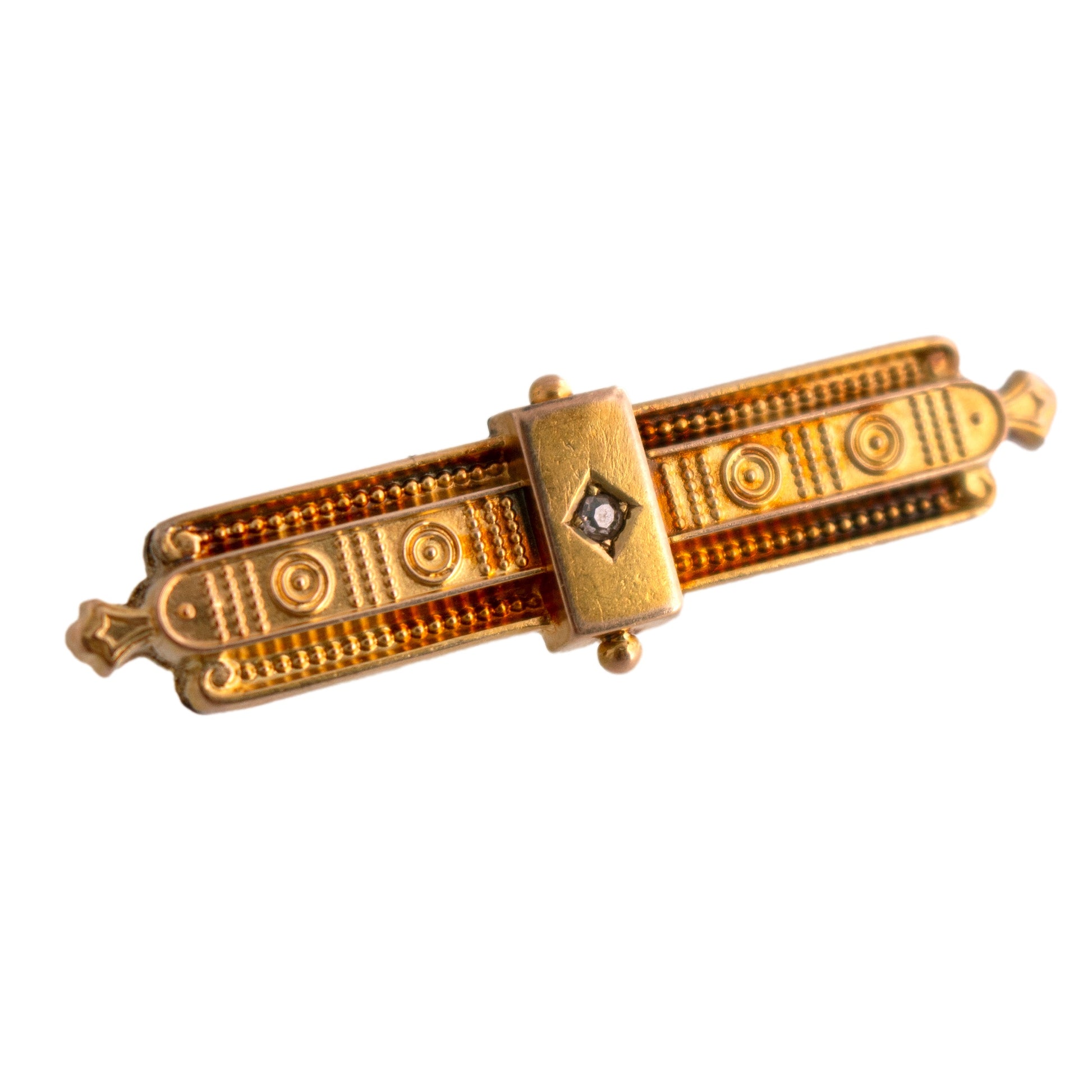 A Victorian 15k yellow gold bar brooch with an old mine cut diamond center. The brooch has some tarnish on the front and shows a little age but overall still in good condition. It is not stamped but it has been tested with an Auracle AGT3 electronic gold tester. It is 1 and 7/8" across.