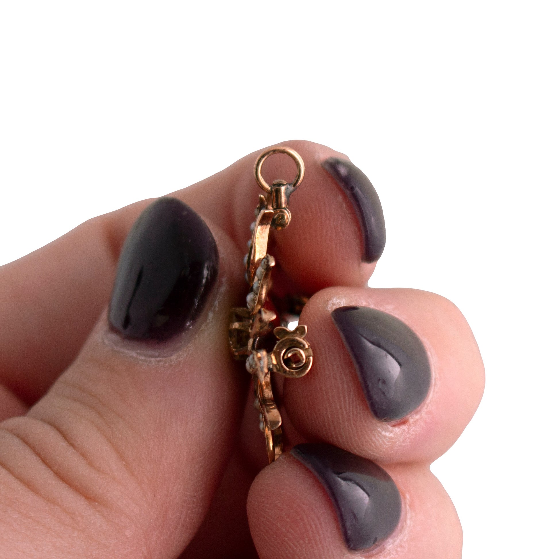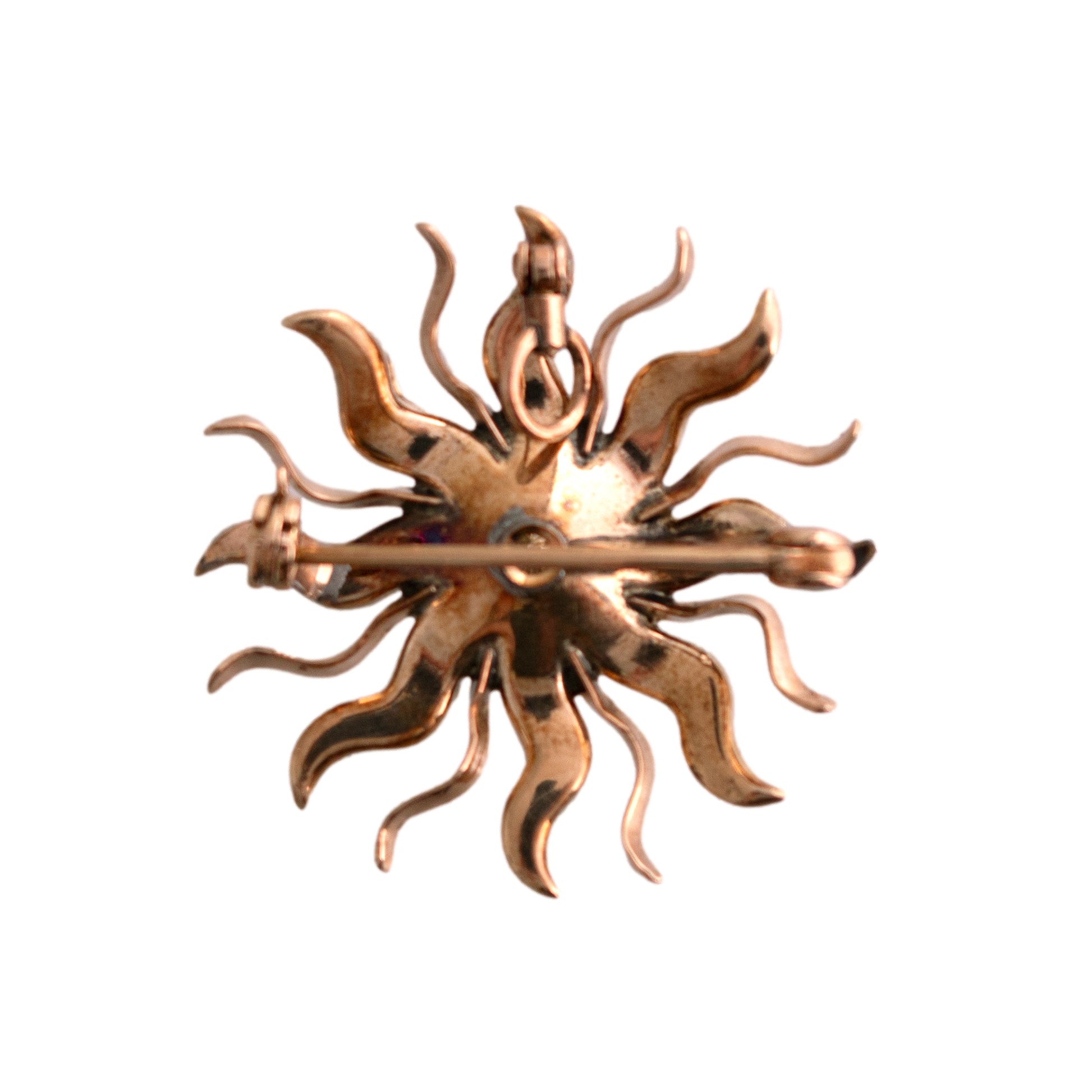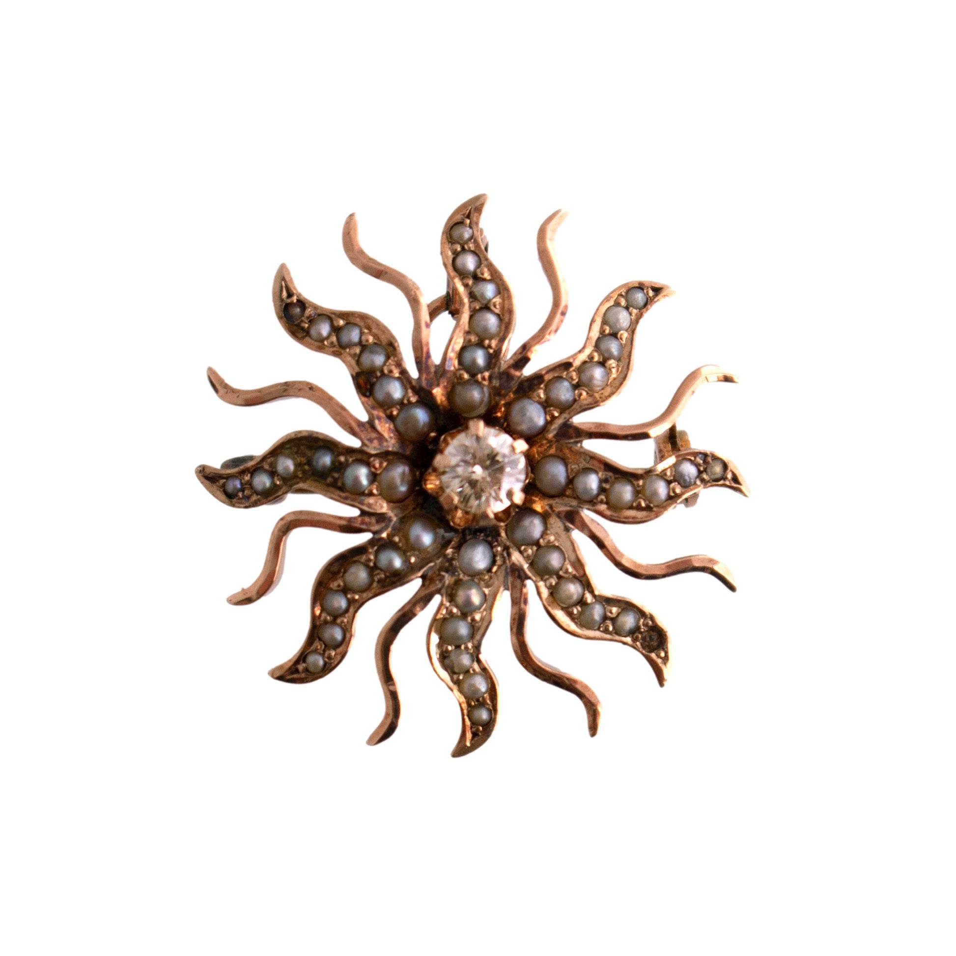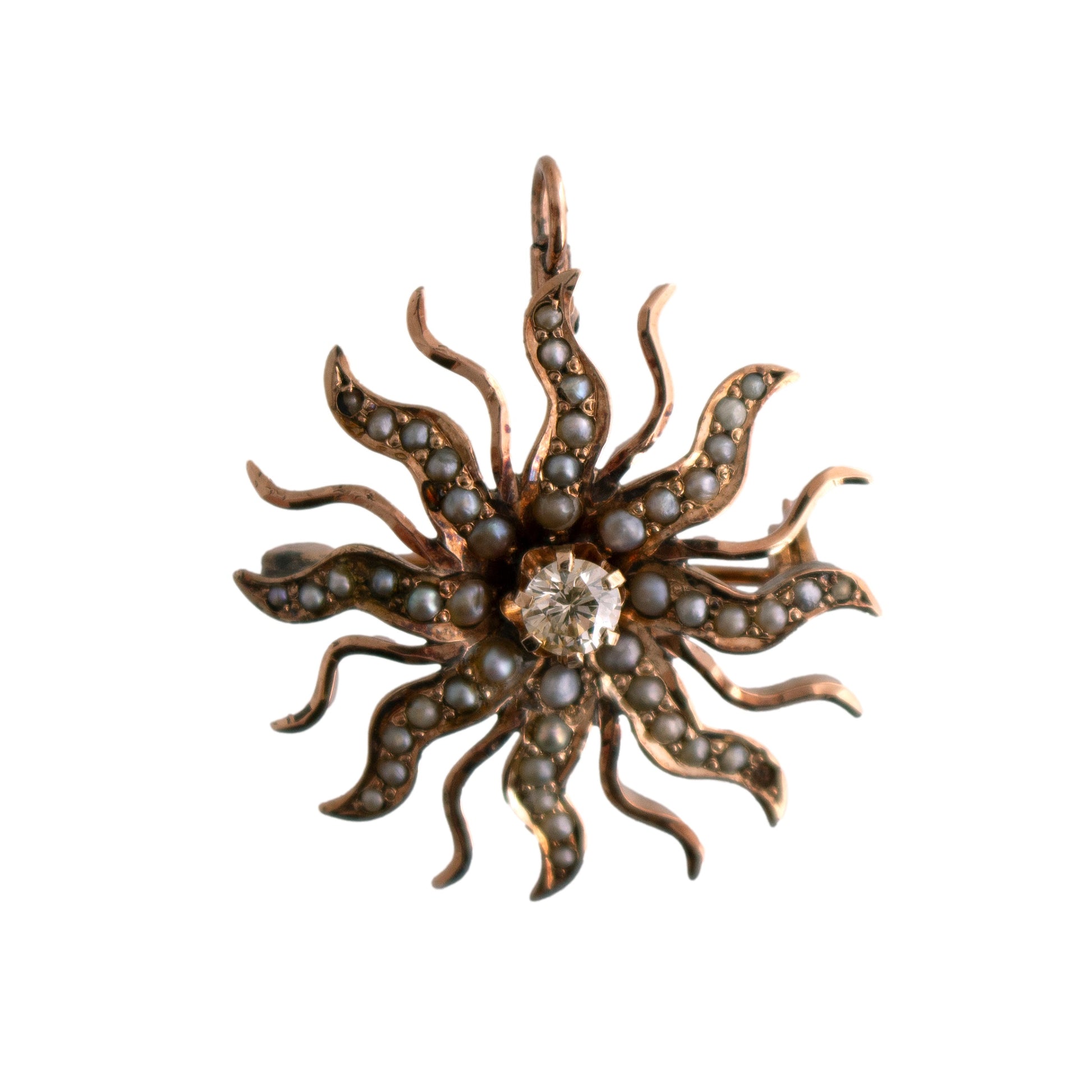 An antique 10k yellow gold diamond and seed pearl starburst pin/pendant. The diamond is 0.15ct in size. The ring on the back flips up so it can be worn as a pendant. This is 1 inch across. In good condition. It has been metal tested with an Auracle AGT3 electronic gold tester.