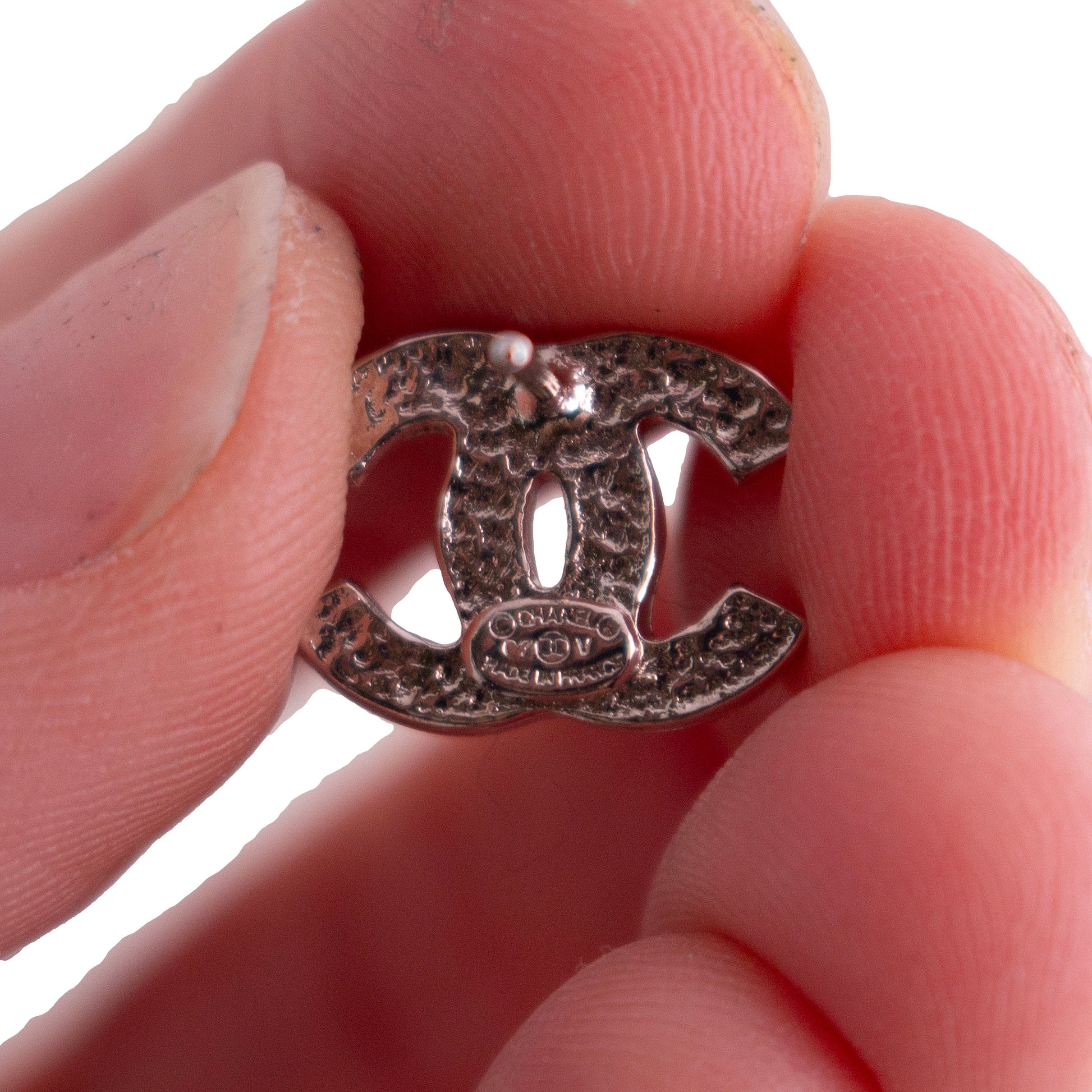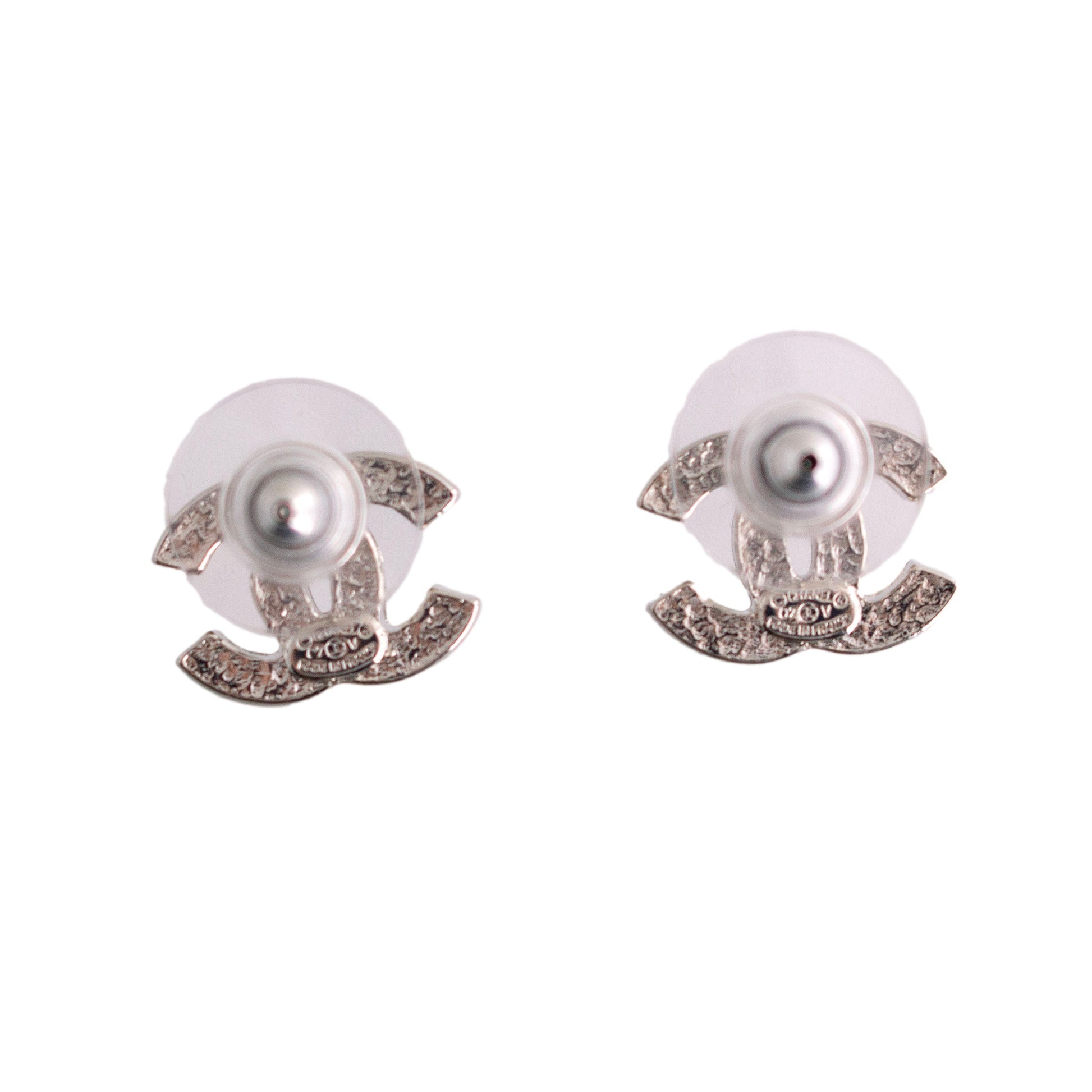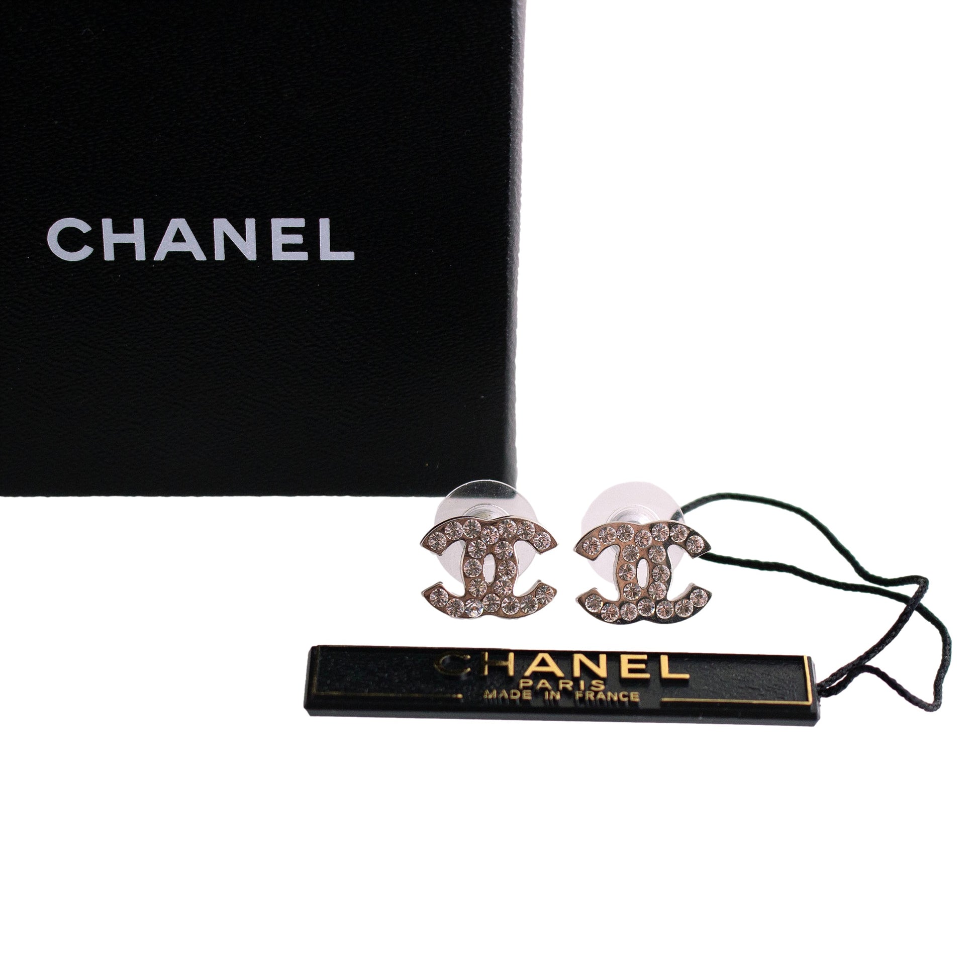 A pair of vintage silver tone Chanel logo earrings with crystals. These are great stud earrings, they come with the original tag and box. In excellent condition. The backs are stamped Chanel 07 (for 2007) V (for Summer) and Made in France. The earrings are 1/2 an inch across.